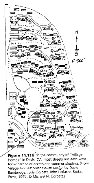 Here is an example of a site layout designed to optimize solar access (comfort), efficiency, density and community space.