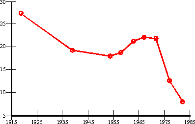 As oil fields go into decline, their EPRs also decline. Translated into energy terms, enhanced oil recovery means low EPR's, below 10 and typically no better than 3. As a field declines, eventually so much energy is used in coaxing oil out of the ground that net yields become insignificant. This transformation can be seen, for example, in the case of Louisiana oil fields, where an overall EPR of 30-40 in the 1960's and 1970's declined to less than 10 by 1990.[22, 23]