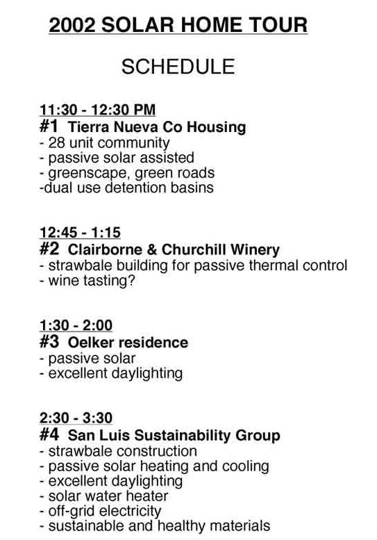 DESCRIPTION: A Tour of a cohousing community, several solar homes and a winery, designed by the San Luis Solar Group. In these buildings the San Luis Solar Group has been able to eliminate virtually all of the energy consumption for space heating and cooling, by careful design and by evaluating the energy consumption of specific design features before the building is built.