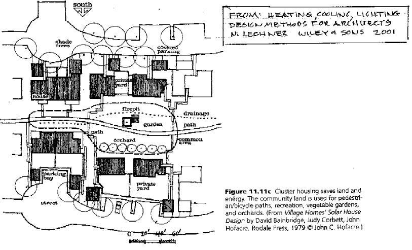 Here is an example of a site layout designed to optimize solar access (comfort), efficiency, density and community space.